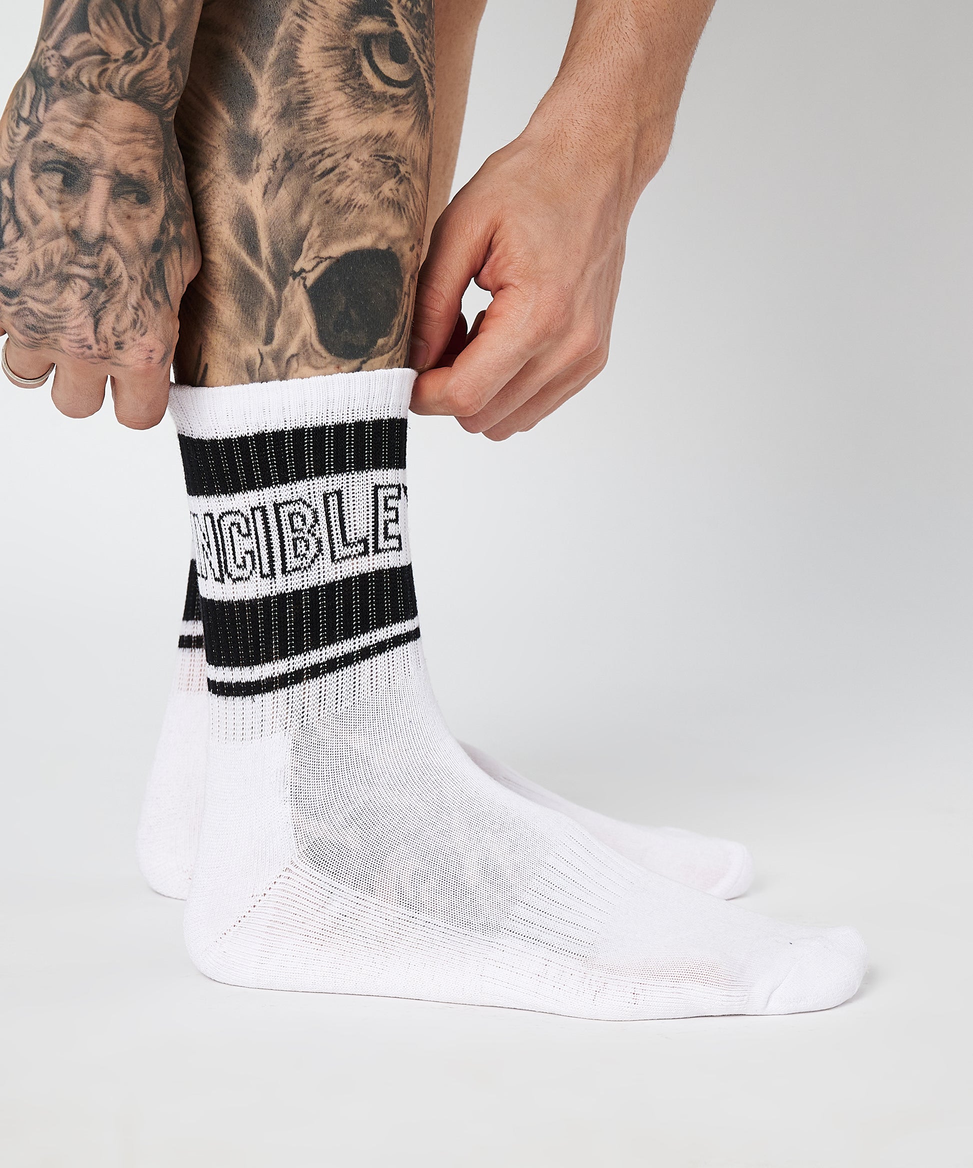 Enhance your performance with Invincible Mid Length Socks. Crafted from a premium blend of nylon and elastane, these socks offer superior comfort, breathability, and durability. With a snug fit and long-lasting wear, the mid-length design provides ample coverage and support, while the "INVINCIBLE" logo and stripes add a touch of edge. Perfect for any active individual.